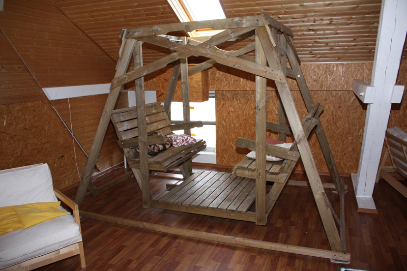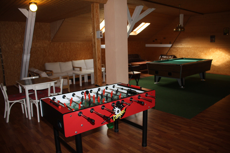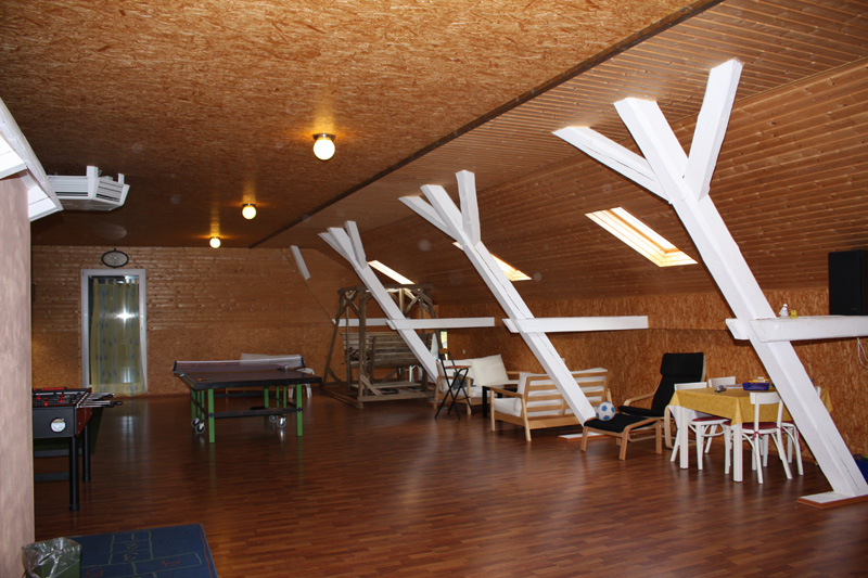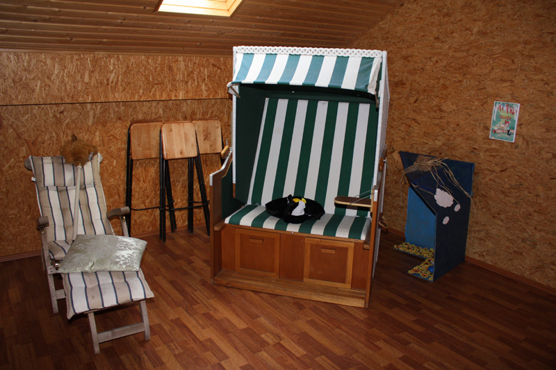 Der „Dachboden“ ist ein ausgebauter Raum direkt über dem Aufenthaltsraum. Auch dieser Raum hat eine Größe von ca. 200 qm und ist ausgestattet mit einem Billardtisch, einem Tischkicker, einem Dartautomat, einer Tischtennisplatte und anderen Spielzeugen, so dass auch bei schlechtem Wetter keine Langeweile aufkommt. Zudem gibt es einige gemütliche Sitzecken, die sich zum gemeinsamen Spielen, Klönen oder zum Lesen eignen.