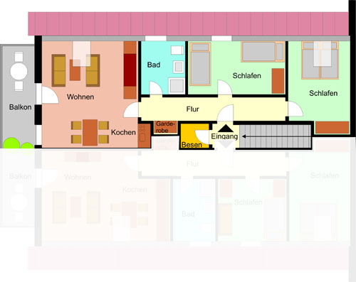 Die Wohnung „Bullerbü“ befindet sich im Obergeschoss und hat 62 m². Die 2 Schlafzimmer, einen Wohn- Essbereich mit integrierter Küche und ein Badezimmer mit Dusche und WC bietet Platz für bis zu 4 Personen. Der Balkon in Südwestlage lädt zur Erholung am Abend oder zu einem Frühstück an frischer Luft ein.